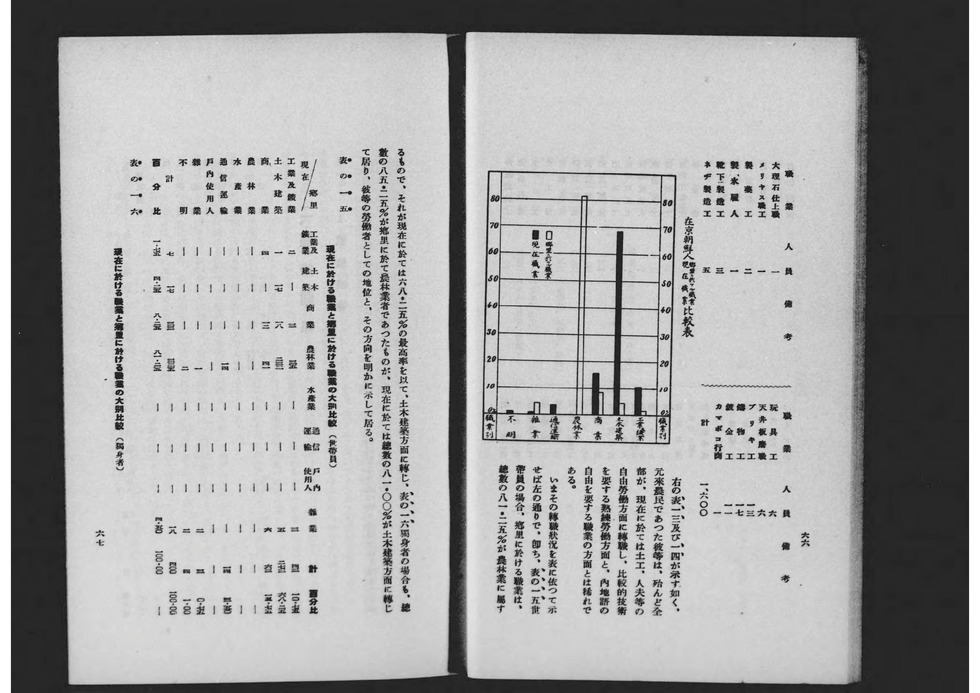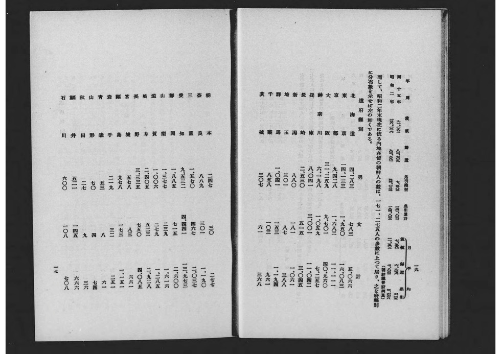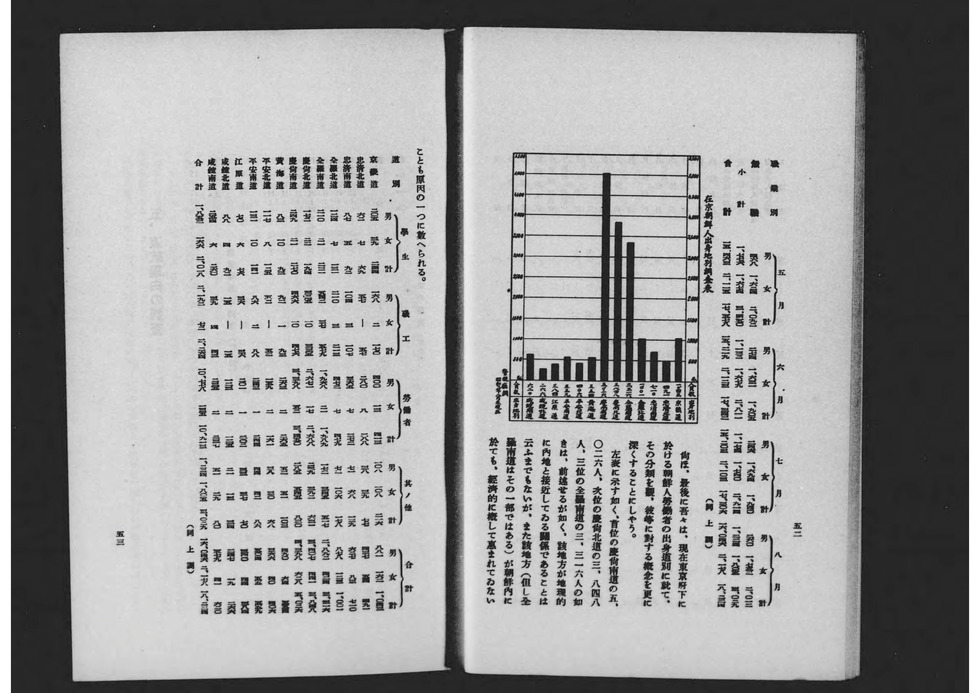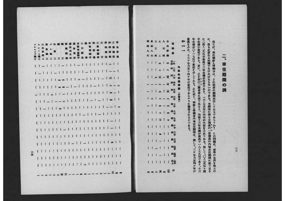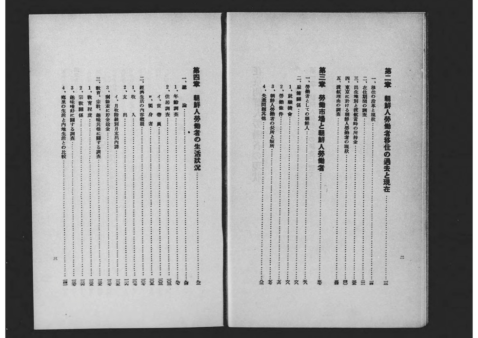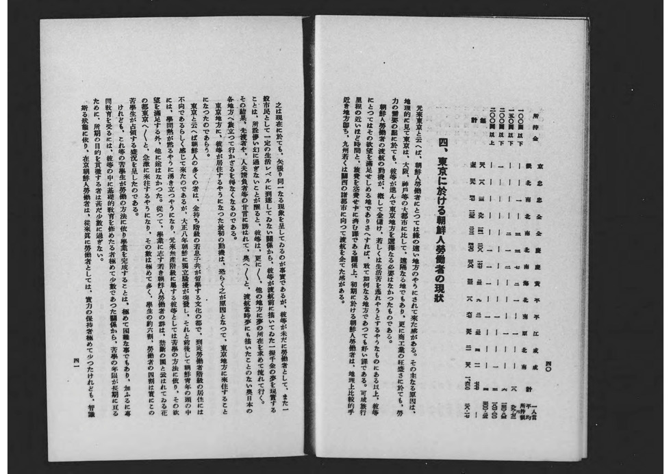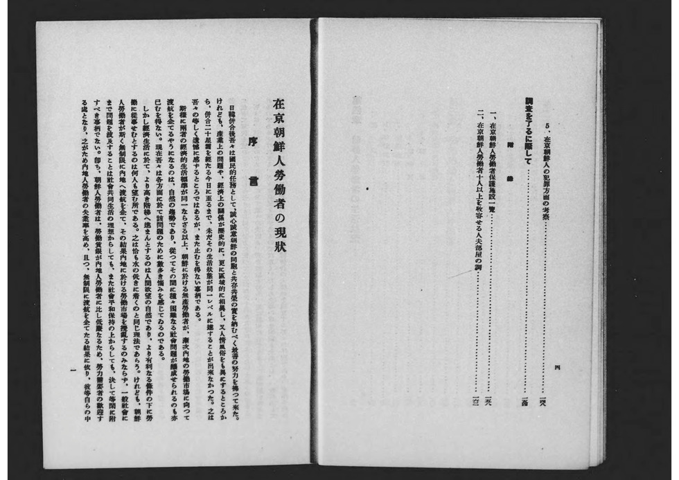 1929년 도쿄부 학무부 사회과가 편집 발행한 도쿄부 산하 조선인 노동자의 실태 등에 관한 조사 보고서. 제1차 세계대전 후 전후 공황이 계속되던 쇼와 초기에는 저렴한 임금과 열악한 환경에서 노동, 생활하던 내지 재류 조선인이나 일본인 모두에게 실업 문제가 발생했고, 또 억눌려 있던 내지로의 도항을 꾀하는 조선인들도 증가해 사회적으로 큰 문제가 되었다. 그리고 오사카부 사회과처럼 이러한 사회문제의 해결과 개선을 위한 조사보고, 당시 말로 '사회학'이 융성했던 시기였다. 본 보고서도 그 예로서 도쿄부가 내놓은 것으로, 노동 상황뿐만 아니라 생활 실태, 내지 도항의 역사 등에 대해서도 조사하고 있어 이 시기 내지의 조선인 노동자에 대해 살펴보는데 중요한 사료가 되고 있다.
